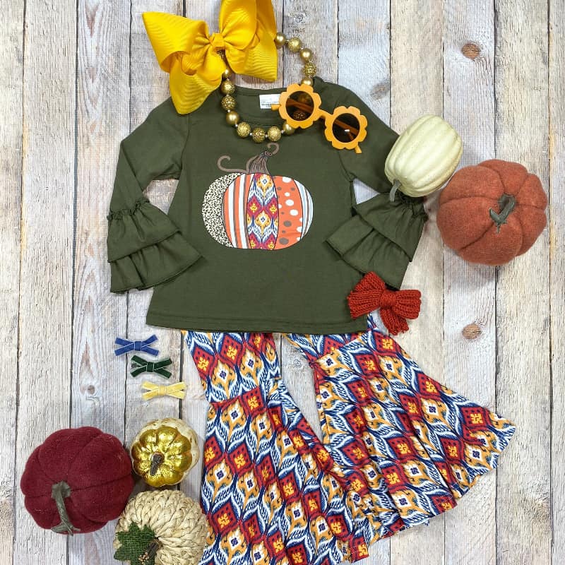 (Custom Design MOQ 5) Green pumpkin top aztec bell pants girls western fall clothes set