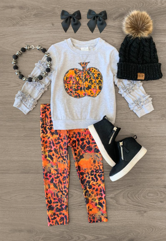 (Custom Design MOQ 5) Grey Pumpkin Ruffles Top Leopard Legging Pants Girls Fall clothes set
