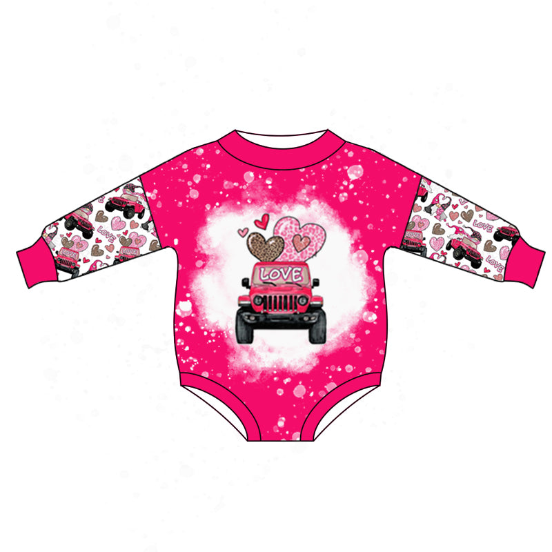 (Custom Design MOQ 5) Hot Pink Heart Truck LOVE Print Baby Girls Valentine's Day Romper