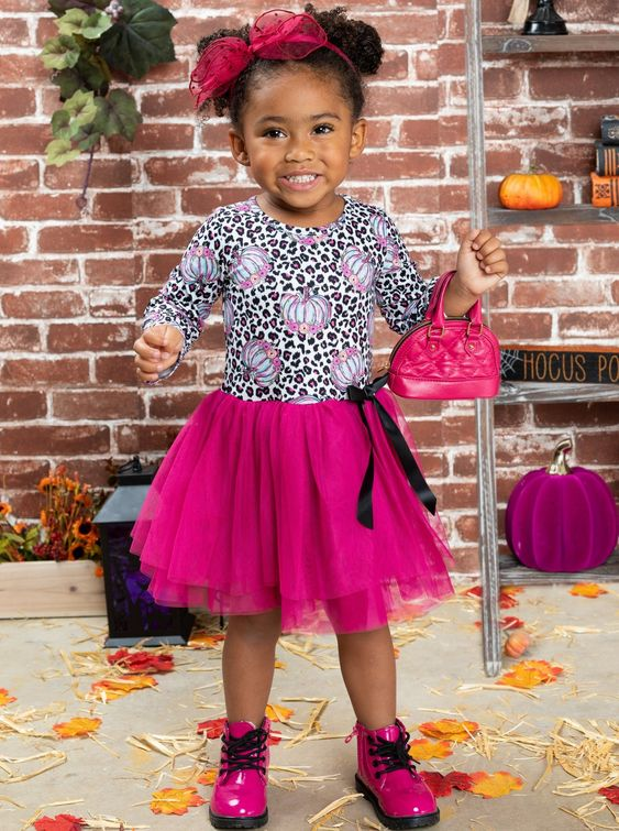 (Custom Design MOQ 5) Leopard pumpkin top hot pink tulle girls fall dress