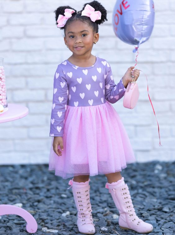 (Custom Design MOQ 5) Light Purple Heart Print Girls Knee Length Valentine's Pink Tulle Dress