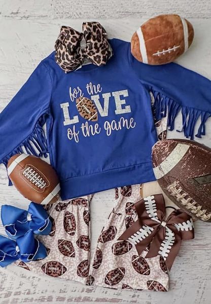 (Custom Design MOQ 5) Love The Game Blue Tassels Top Football Bell Pants Girls Clothes Set