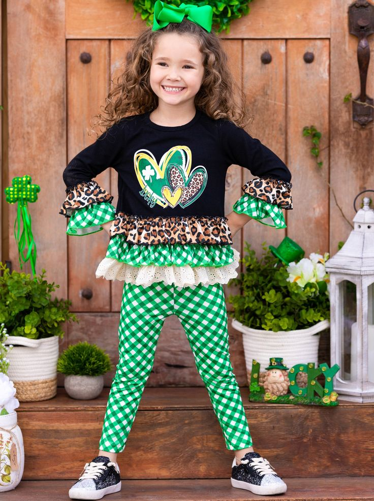 (Custom Design MOQ 5) Luck Heart Ruffles Top Green Plaid Legging Pants St. Patrick's Girls Clothes set