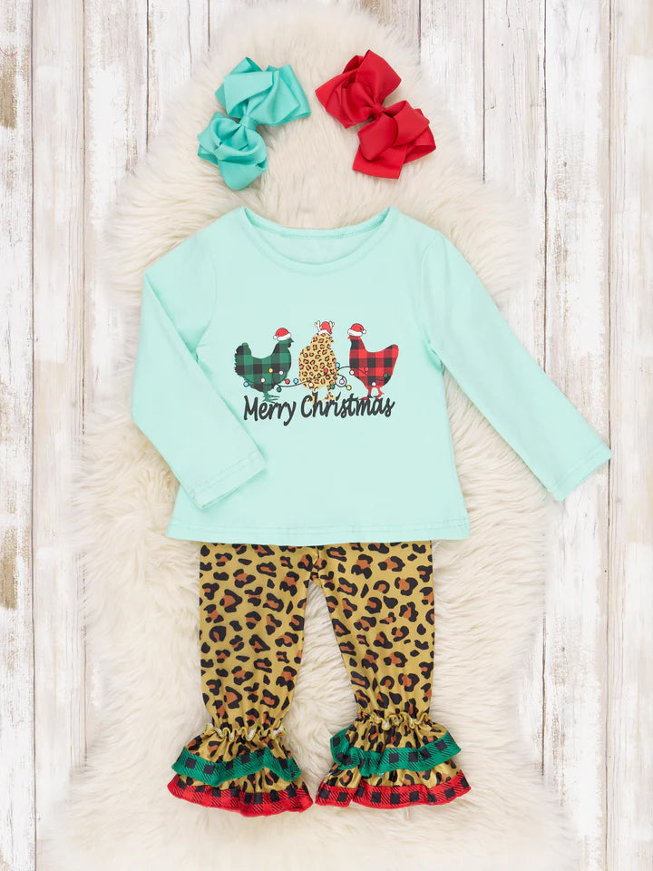 (Custom Design MOQ 5) Merry Christmas leopard chicken print ruffles pants girls clothes set