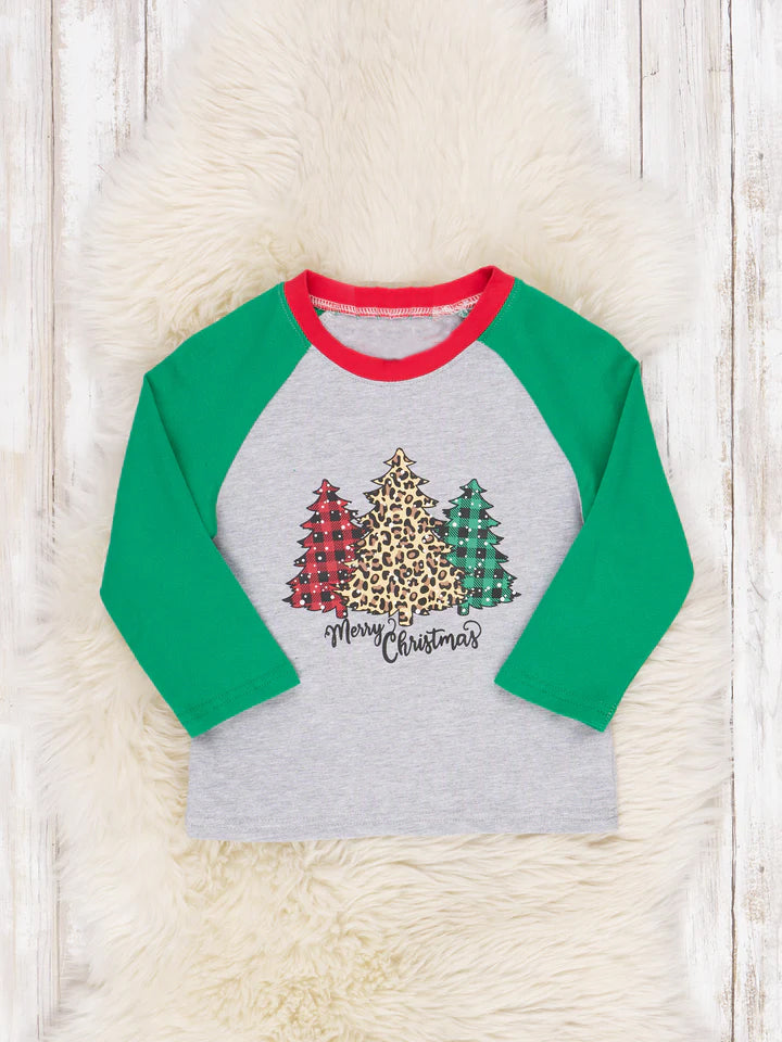 (Custom Design MOQ 5) Merry Christmas leopard tree print green raglan sleeve boys tee shirts top