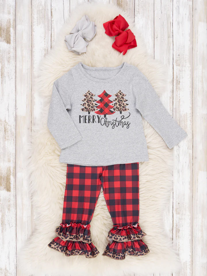 (Custom Design MOQ 5) Merry Christmas leopard tree print red plaid pants girls clothes set