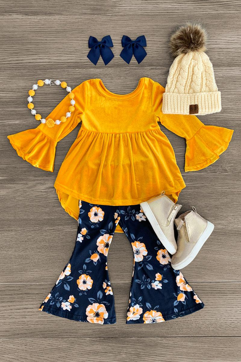(Custom Design MOQ 5) Mustard velvet tunic top flowers bell pants girls fall clothes set