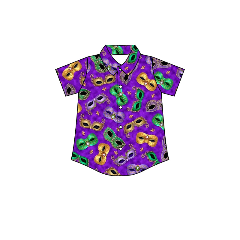 (Custom Design MOQ 5) NO.6 Purple Mask Mardi Gras Boys Button Tee Shirts Top