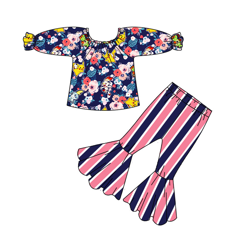 (Custom Design MOQ 5) Off shoulder flowers cartoon design stripes bell pants girls outfits