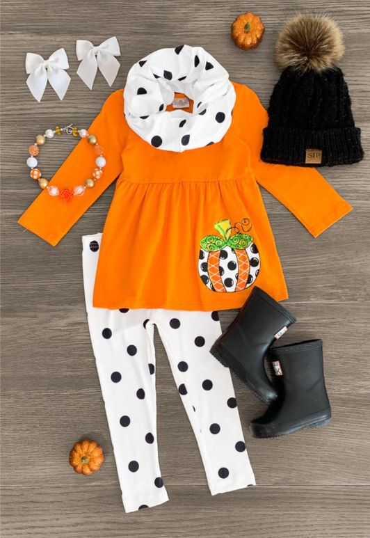 (Custom Design MOQ 5) Orange Pumpkin Tunic Top Legging Pants Girls Fall 3 Pieces clothes set