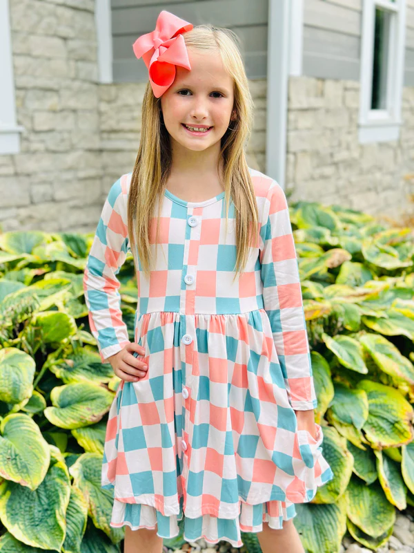 (Custom Design MOQ 5) Pink blue plaid pockets girls knee length dress