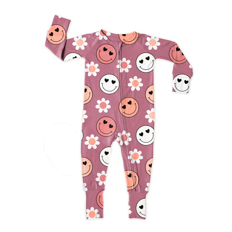 (Custom Design MOQ 5) Pink flowers smiling face print baby girls zipper romper