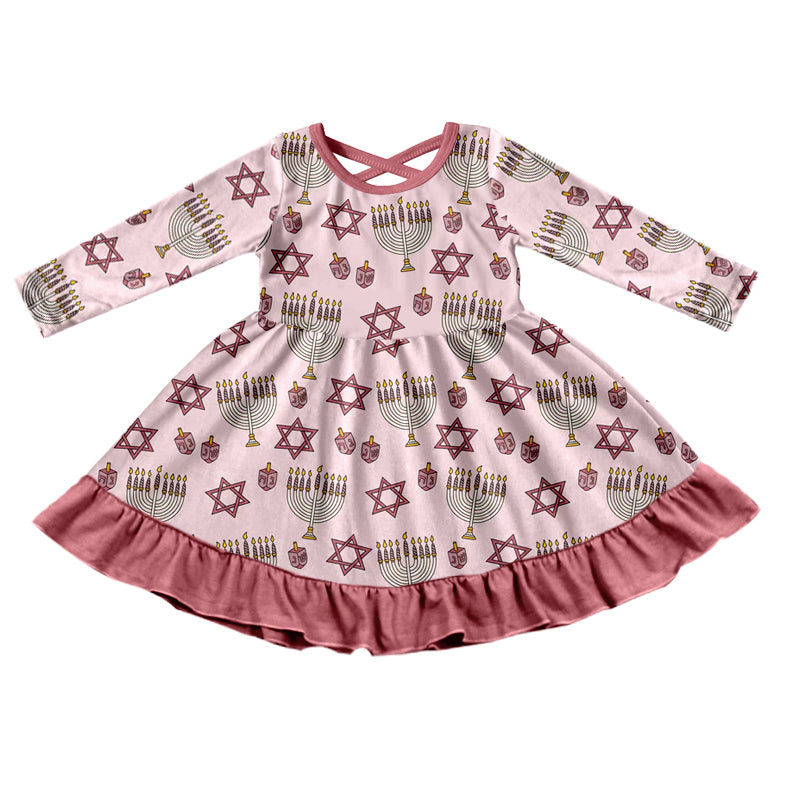 (Custom Design MOQ 5) Pink Hanukkah Print Girls Knee Length Dress