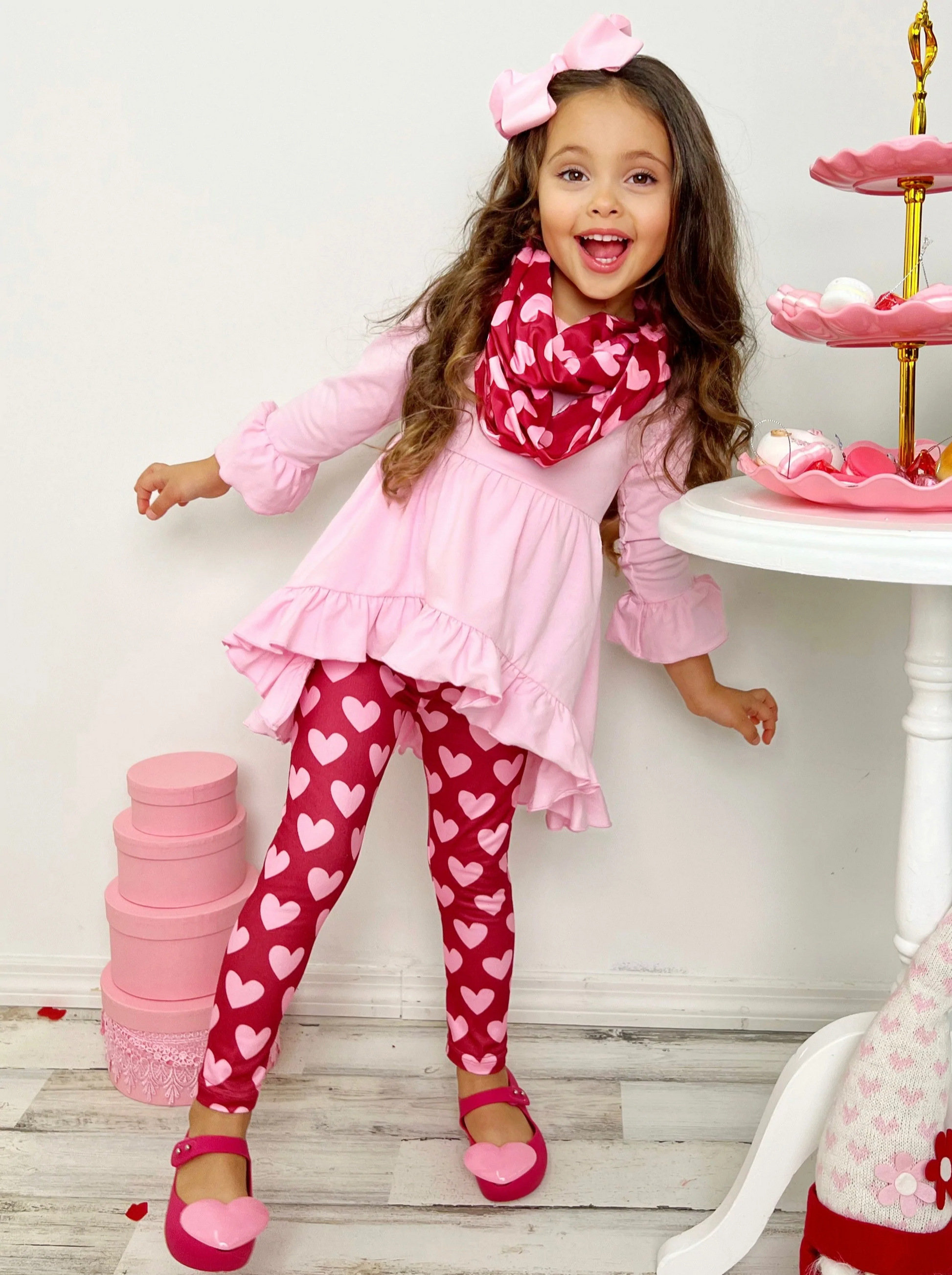 (Custom Design MOQ 5) Pink Tunic Top Red Heart Legging Pants Girls 3 Pieces Valentine's Clothes set