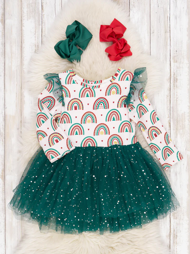 (Custom Design MOQ 5) Rainbow Christmas tree knee length tulle dress
