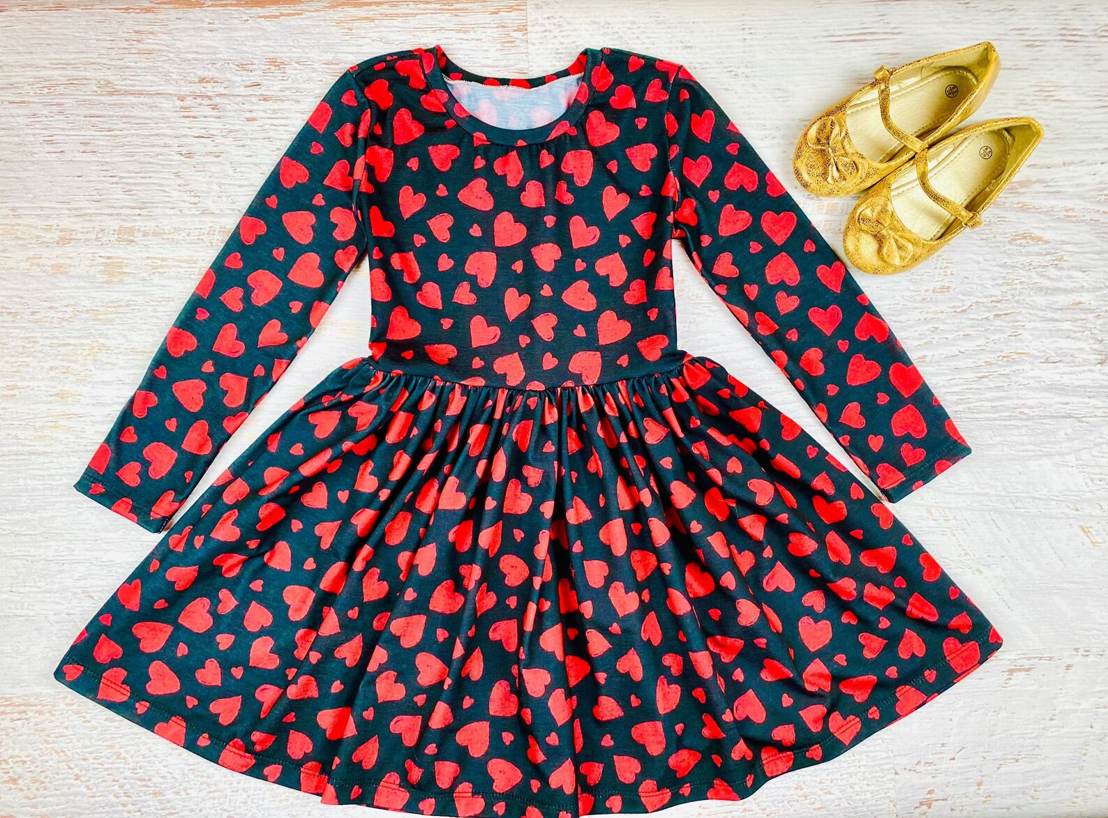 (Custom Design MOQ 5) Red Heart Print Girls Black Knee Length Valentine's Dress