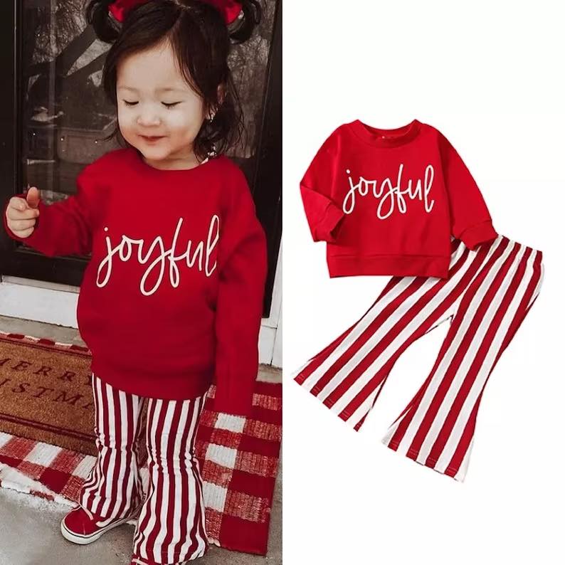 (Custom Design MOQ 5) Red Stripes Girls Bell Bottom Pants Chtistmas Clothes Set