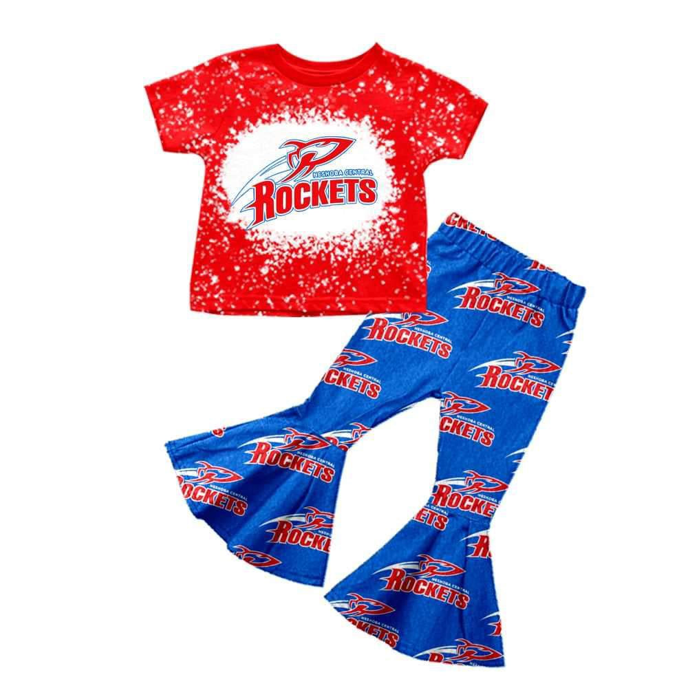 (Custom Design MOQ 5) Red Top Blue Bell Pants Girls Football Team's Clothes Set