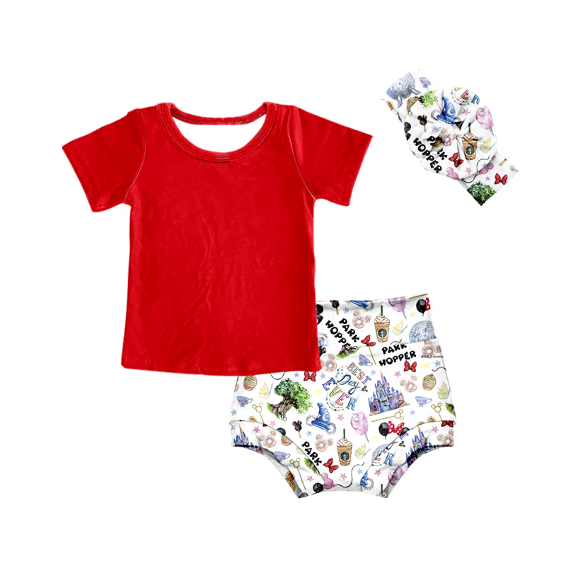 (Custom Design MOQ 5) Red Top Cartoon Mouse Shorts Baby Girls Summer 3 Pieces Bummie Sets