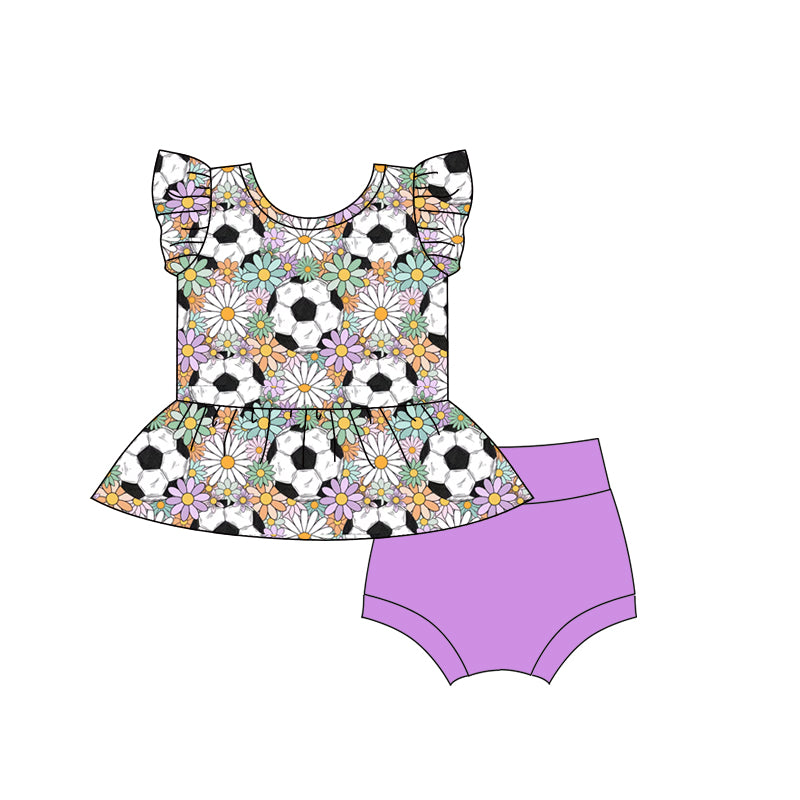 (Custom Design MOQ 5) Soccer Flowers Print Baby Girls Summer Bummie Sets