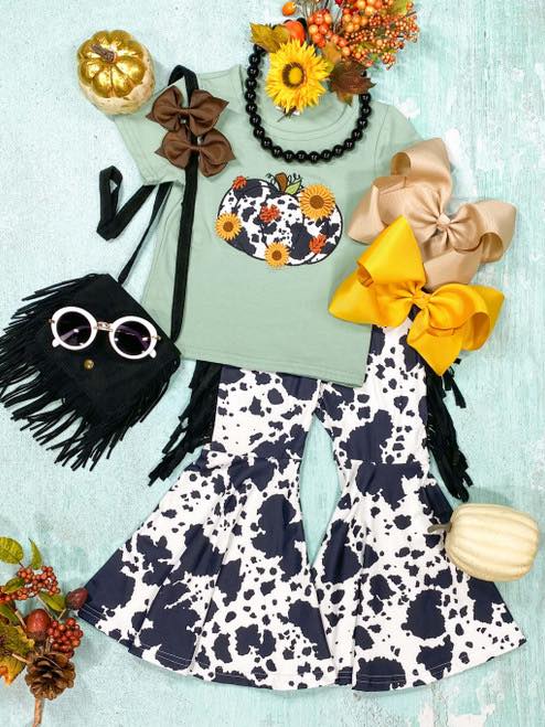 (Custom Design MOQ 5) Sunflowers pumpkin print bell pants girls fall clothes set