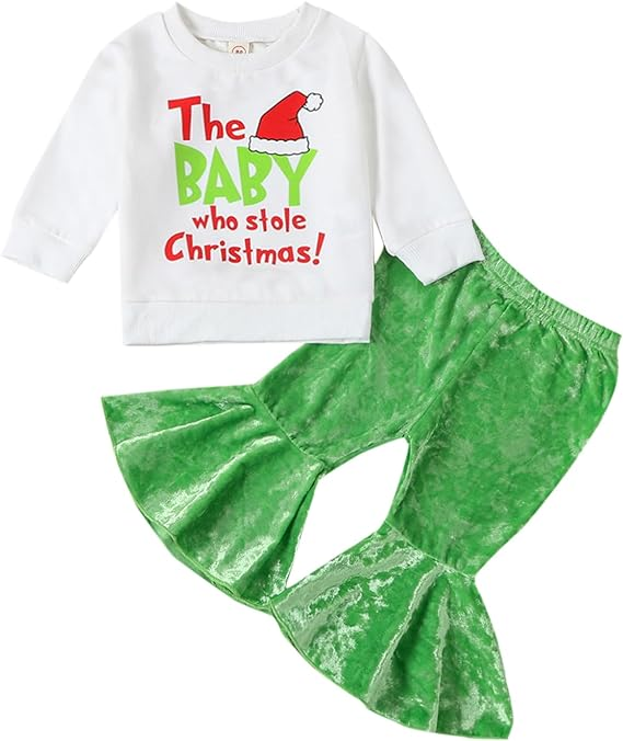 (Custom Design MOQ 5) The Baby Who Stole Christmas Top Green Velvet Bell Pants Girls Clothes set