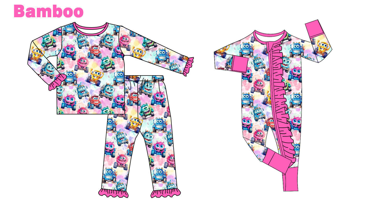 (Custom Design Preorder MOQ 20 Each Design) Cartoon Monster Trucks Print Girls Pajamas Matching Bamboo Clothes Sisters Wear