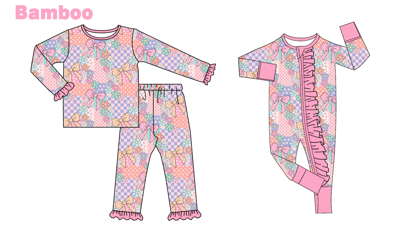 (Custom Design Preorder MOQ 20 Each Design) Flowers Bows Print Girls Pajamas Matching Bamboo Clothes Sisters Wear