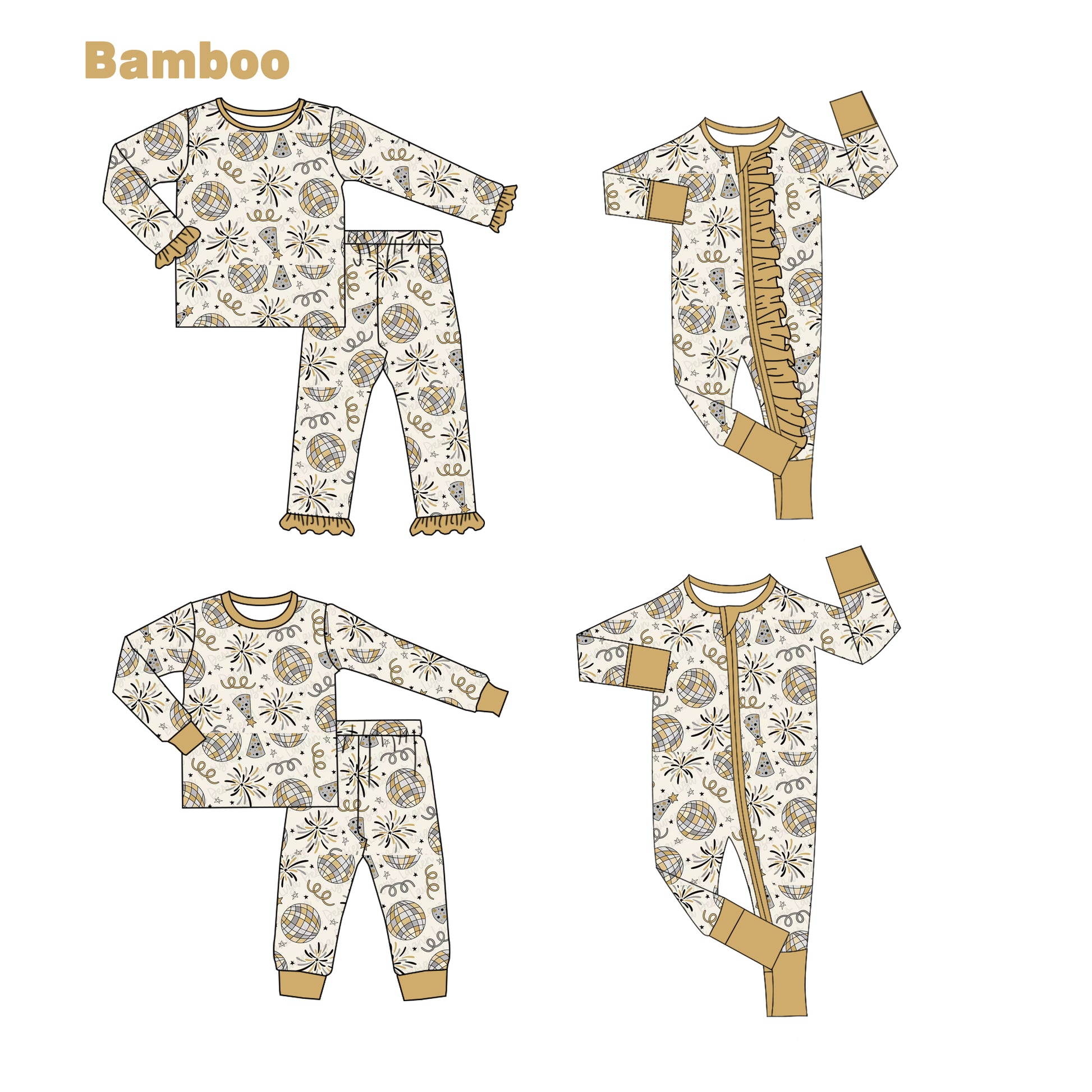 (Custom Design Preorder MOQ 20 Each Design) Happy New Year Gold Print Kids Pajamas Matching Bamboo Clothes Sibling Wear