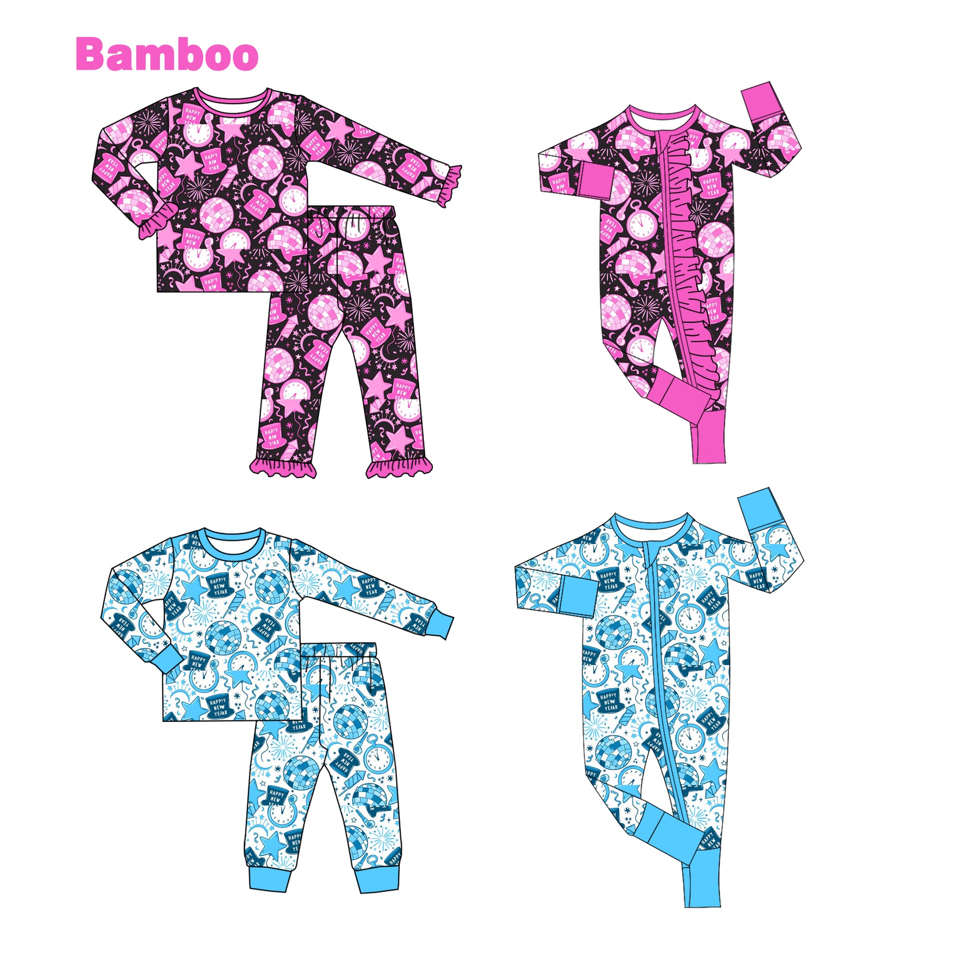 (Custom Design Preorder MOQ 20 Each Design) Happy New Year Print Kids Pajamas Matching Bamboo Clothes Sibling Wear
