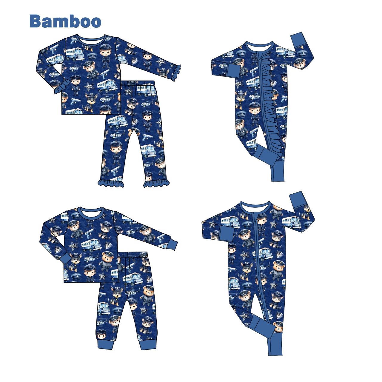 (Custom Design Preorder MOQ 20 Each Design) Police Bear Blue Print Kids Pajamas Matching Bamboo Clothes Sibling Wear