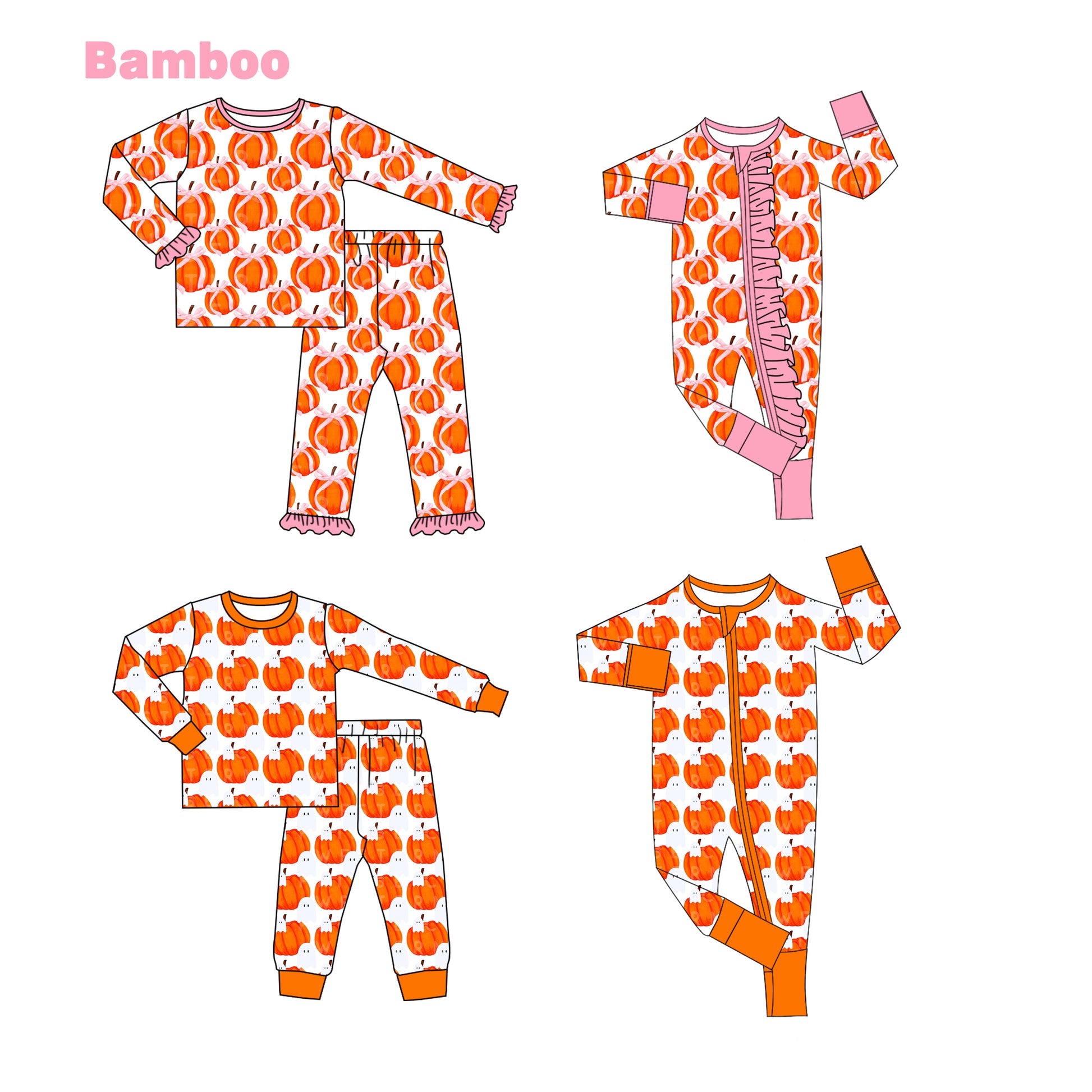 (Custom Design Preorder MOQ 20 Each Design) Pumpkin Print Kids Fall Pajamas Matching Bamboo Clothes Sibling Wear