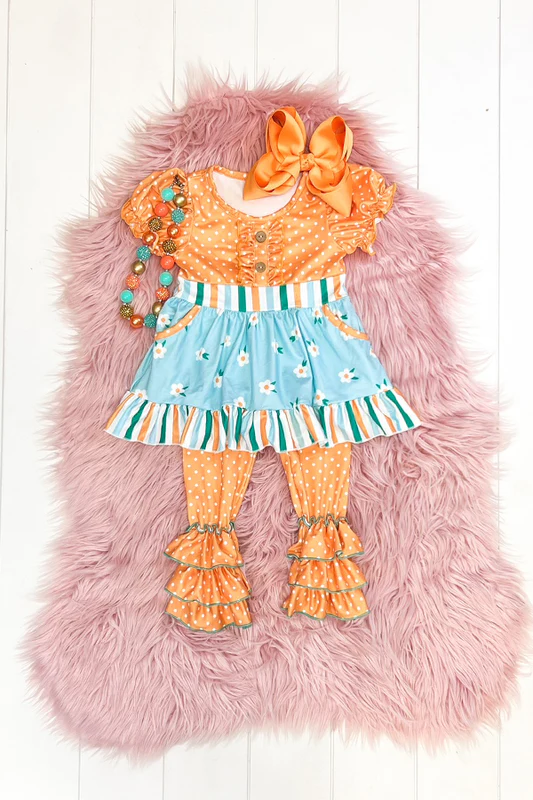 (Custom Design Preorder MOQ 5) Blue Flowers Tunic Top Ruffles Pants Girls Clothes Set
