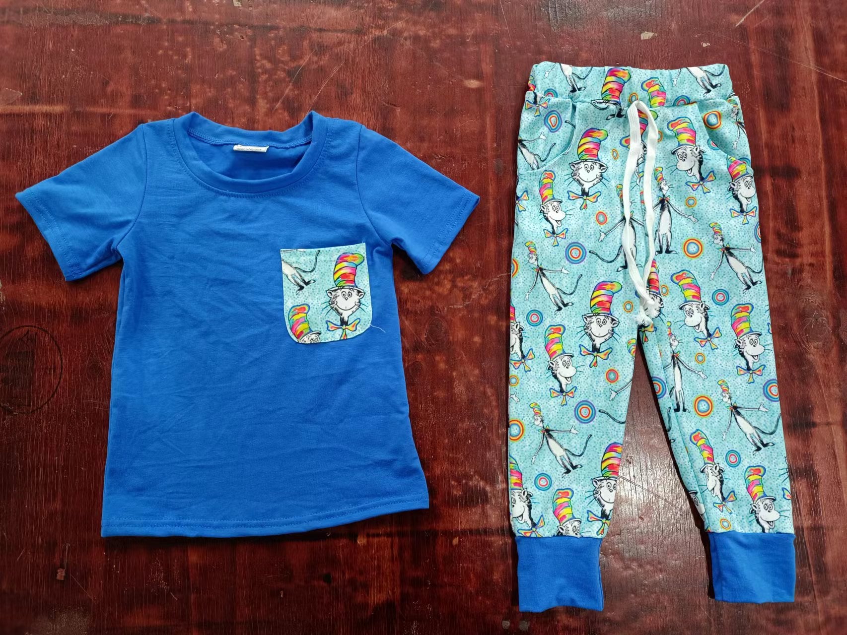 (Custom Design Preorder MOQ 5) Blue Pocket Top Cat Dr.Reading Pants Boys Clothes Set