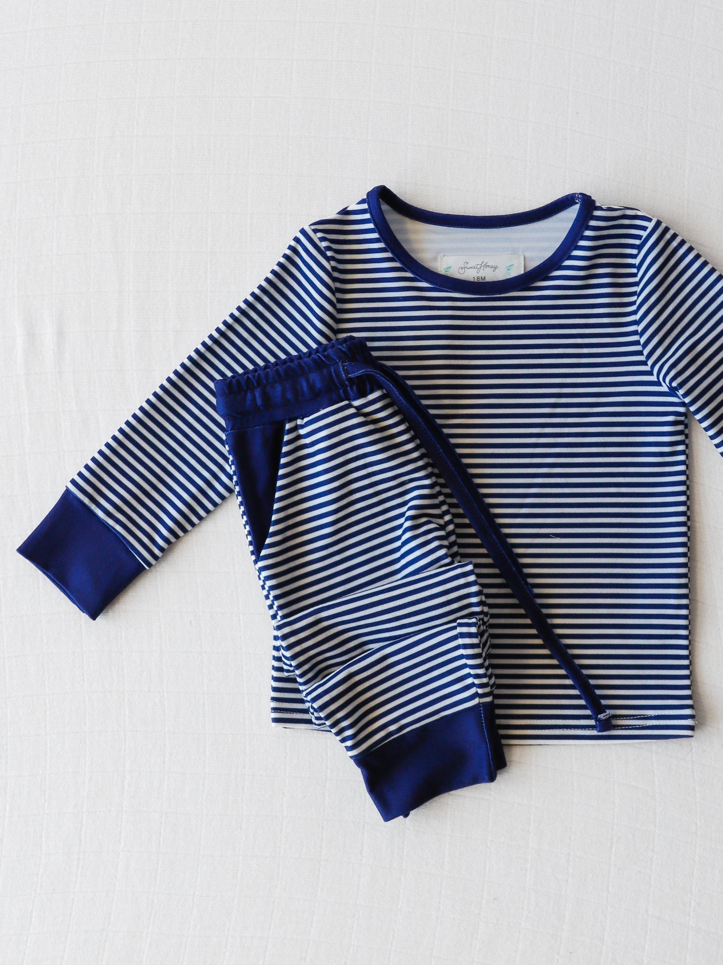 (Custom Design Preorder MOQ 20) Blue Stripes Print Boys Fall Pajamas Bamboo Clothes Set