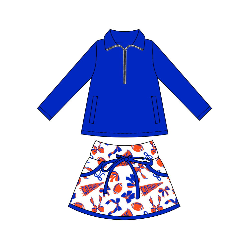 (Custom Design Preorder MOQ 5) Blue Zipper Pullover Top Team's Cheer Bows Skirts Girls Clothes Sets