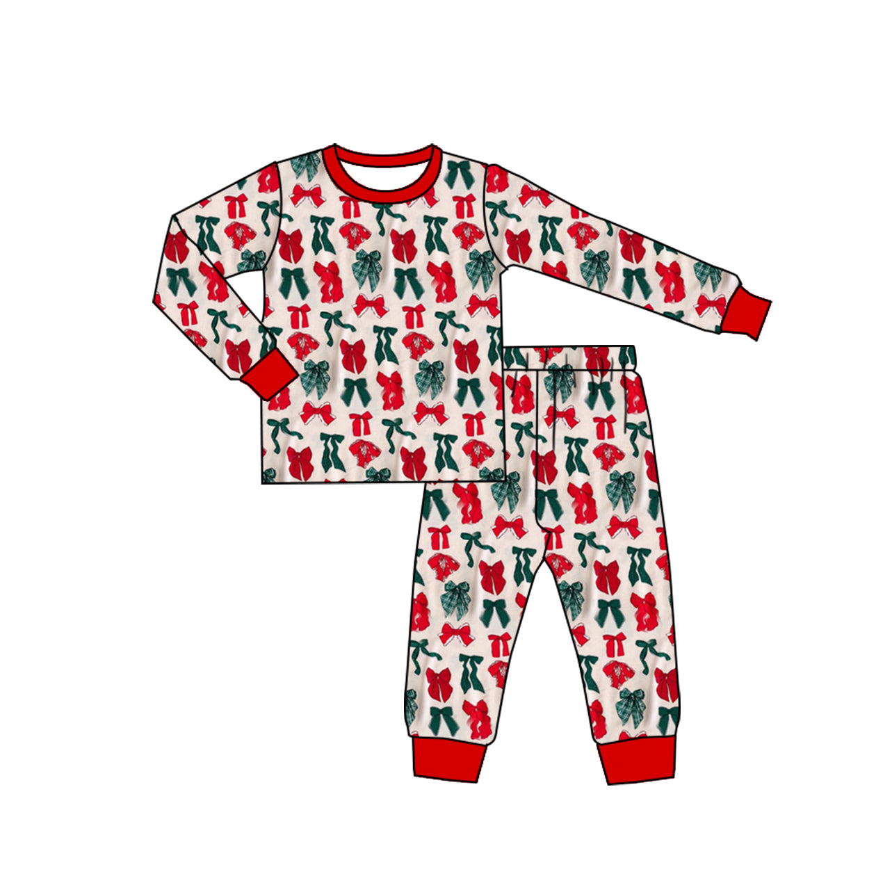 (Custom Design Preorder MOQ 20) Bows Print Girls Christmas Pajamas Bamboo Clothes Set