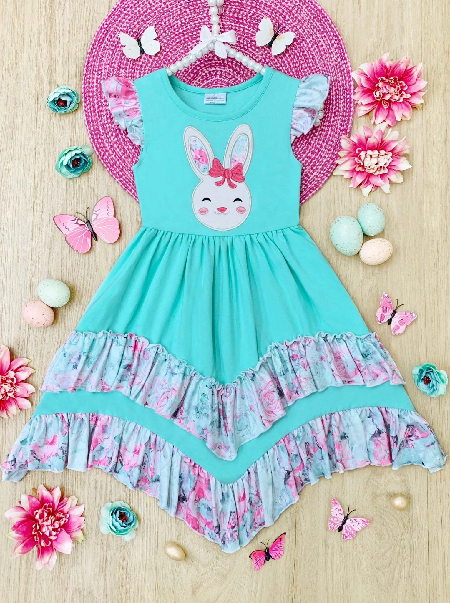 (Custom Design Preorder MOQ 5) Bunny Flowers Blue Print Girls Easter Ankle Length Dress
