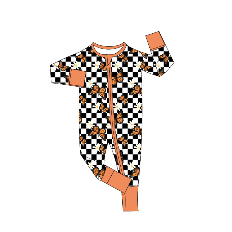 (Custom Design Preorder MOQ 20) Butterfly Flowers Plaid Print Baby Girls Fall Bamboo Sleeper Zipper Romper