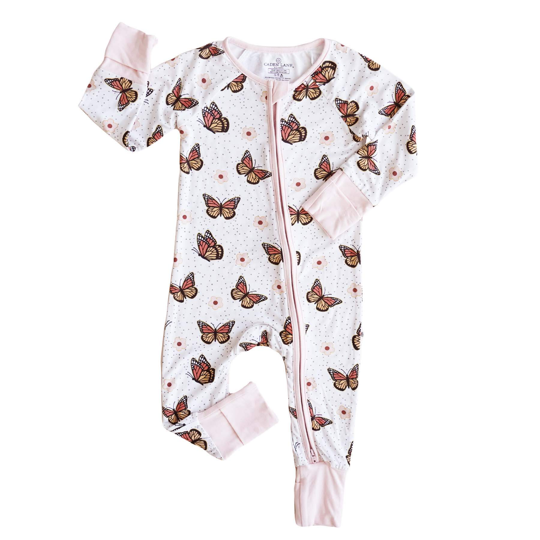 (Custom Design Preorder MOQ 20) Butterfly Pink Flowers Print Baby Girls Bamboo Fall Sleeper Zipper Romper