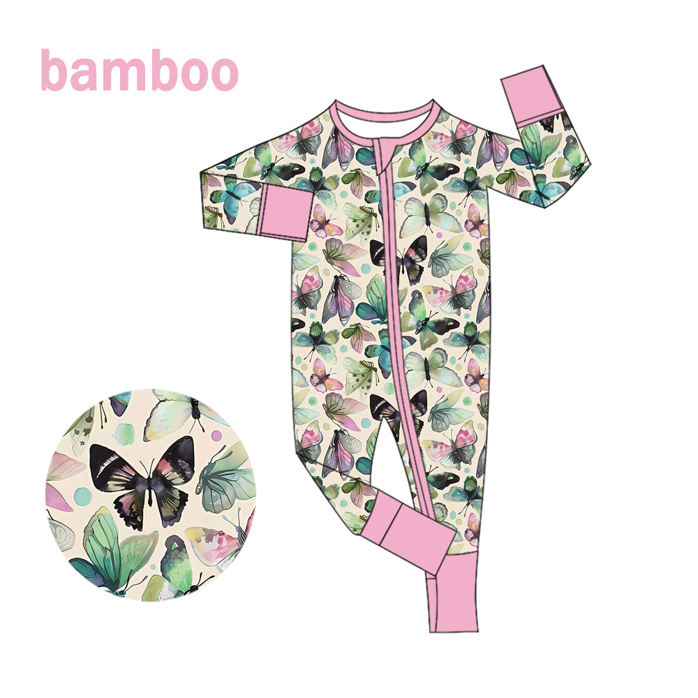 (Custom Design Preorder MOQ 20) Butterfly Print Baby Girls Long Sleeve Bamboo Sleeper Zipper Romper