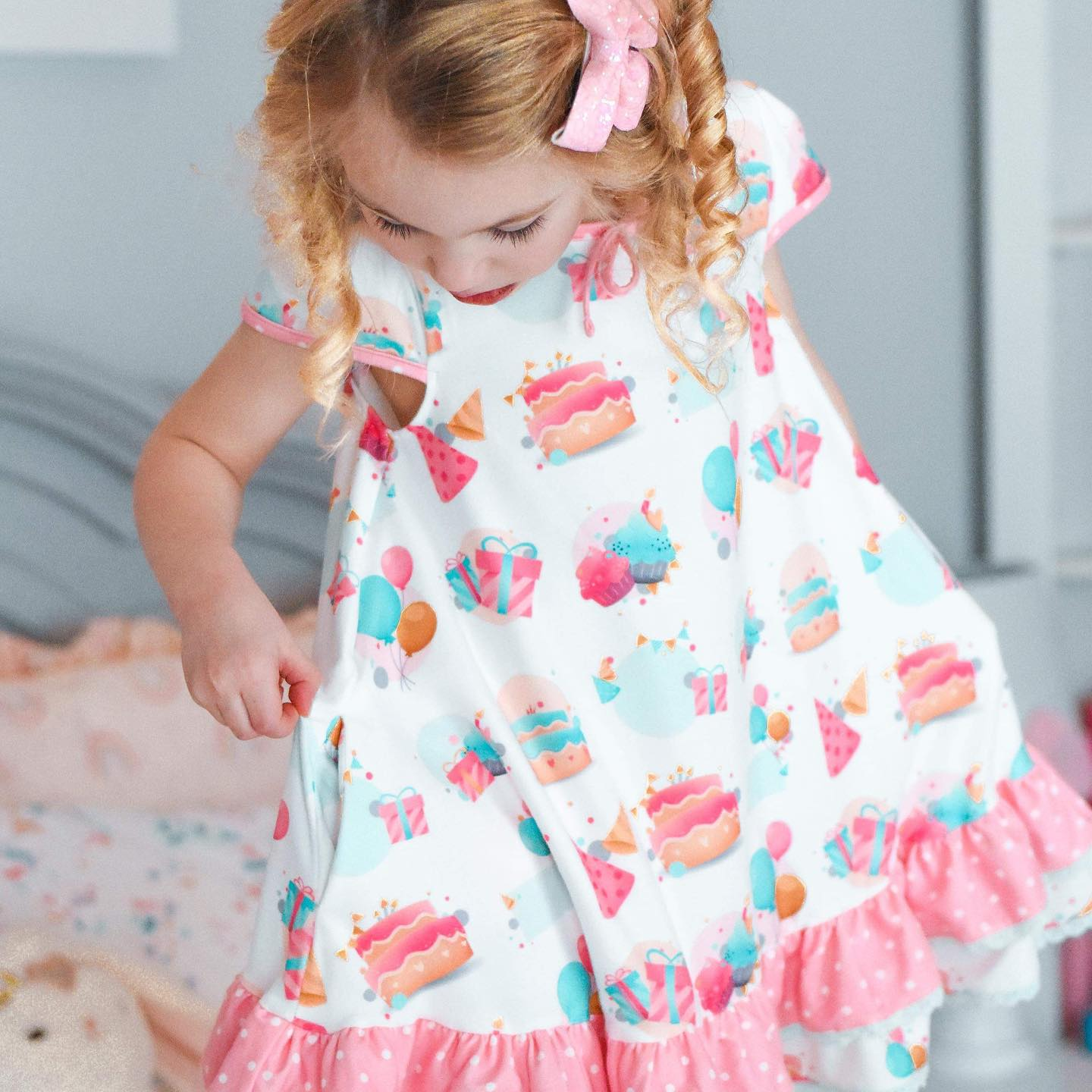 (Custom Design Preorder MOQ 5) Cake Gift Balloon Print Girls Happy Birthday Knee Length Dress
