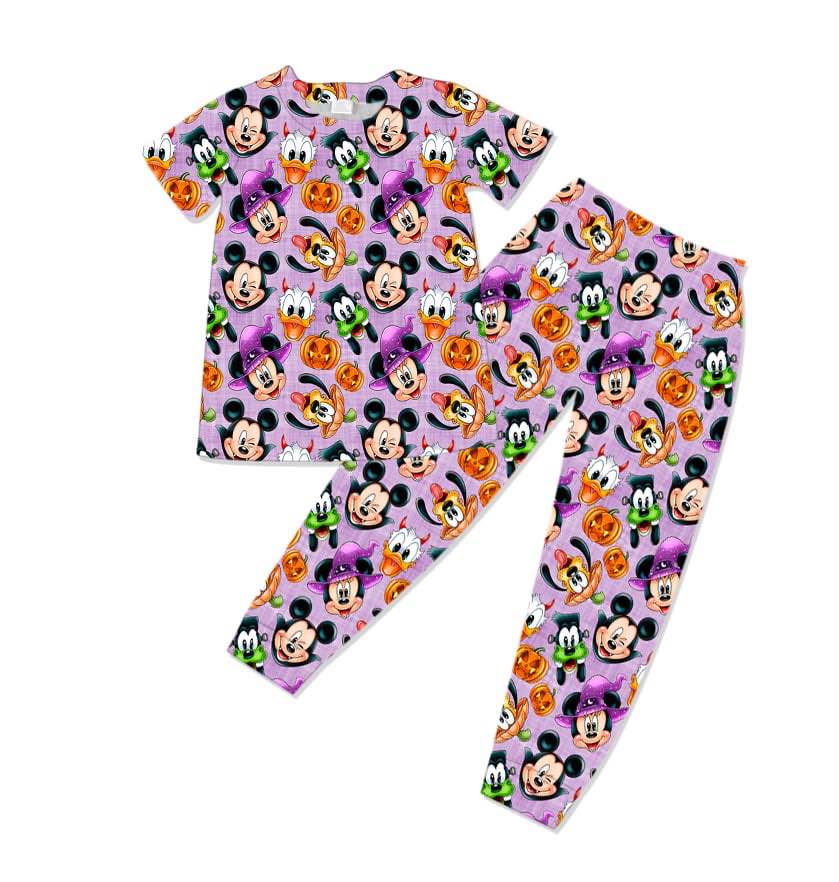 (Custom Design Preorder MOQ 20) Cartoon Animals Pumpkin Print Kids Halloween Bamboo Pajamas Clothes Set