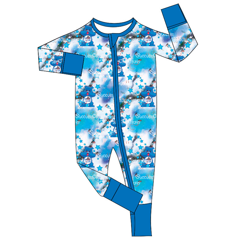 (Custom Design Preorder MOQ 20) Cartoon Bear Blue Print Baby Fall Bamboo Sleeper Zipper Romper