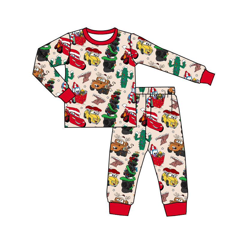 (Custom Design Preorder MOQ 20) Cartoon Cars Print Kids Christmas Bamboo Pajamas Clothes Set