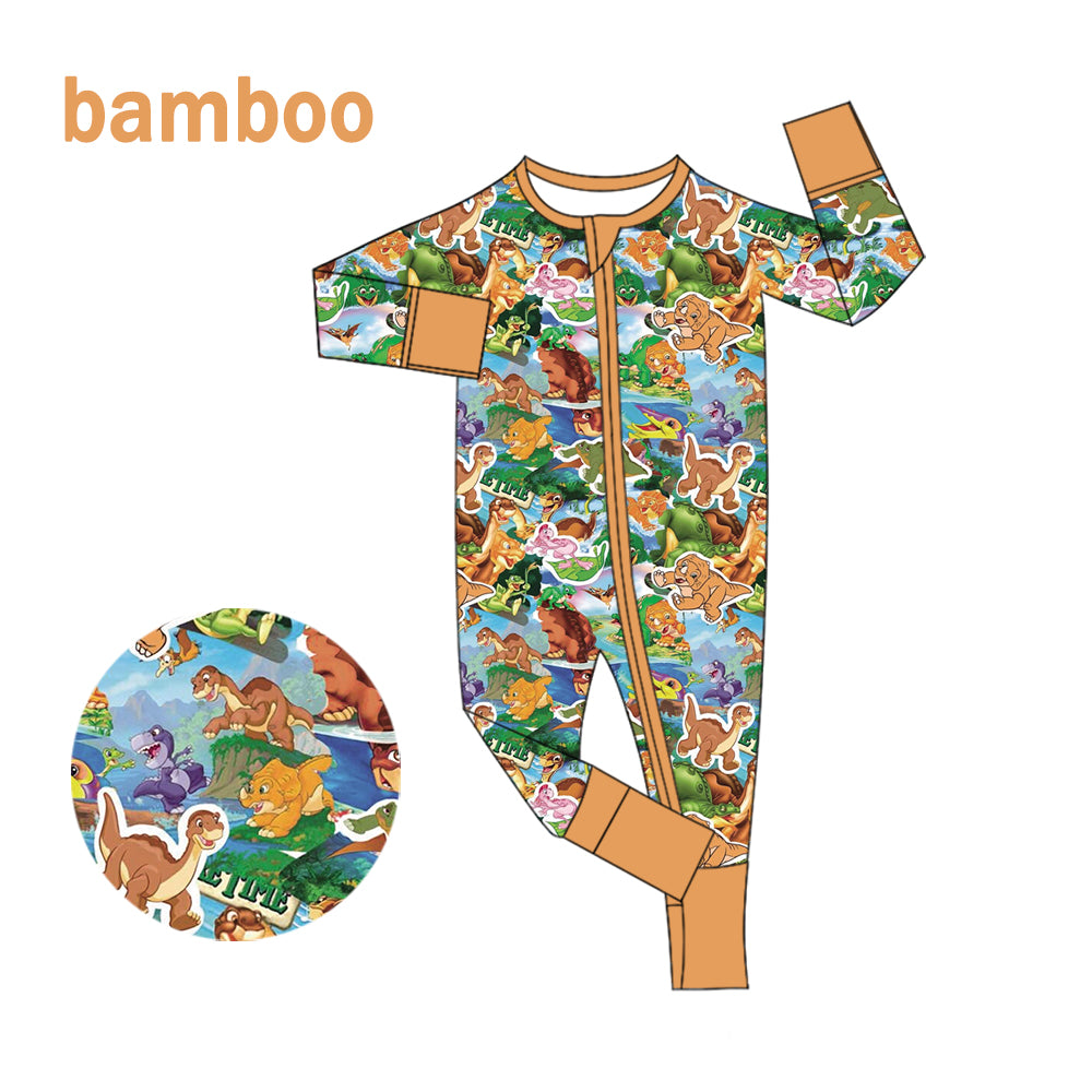(Custom Design Preorder MOQ 20) Cartoon Dino Print Baby Girls Long Sleeve Bamboo Sleeper Zipper Romper