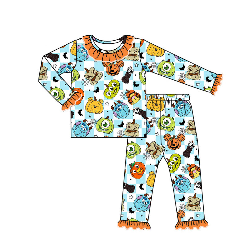 (Custom Design Preorder MOQ 20) Cartoon Figure Pumpkin Print Girls Bamboo Halloween Pajamas Clothes Set