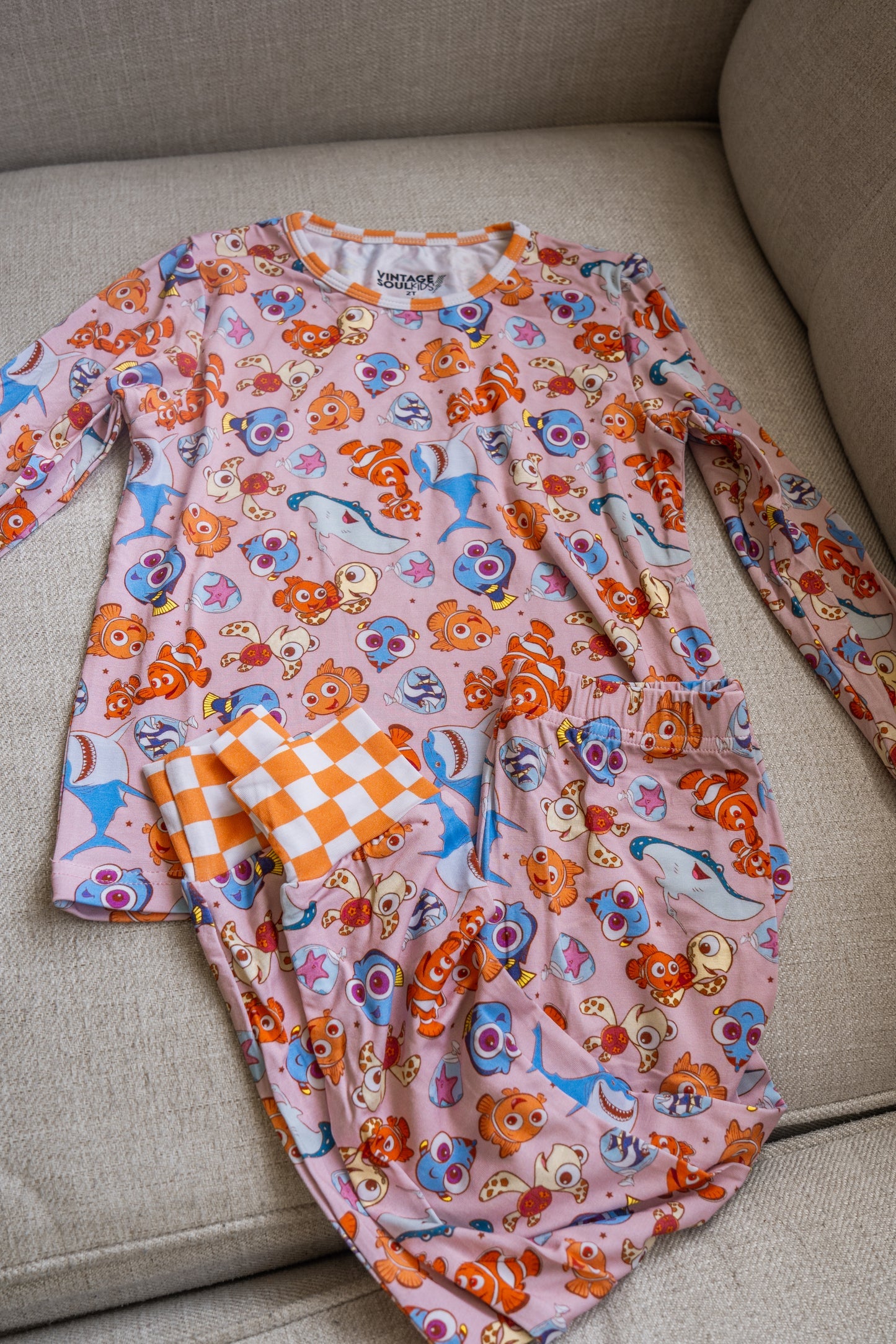 (Custom Design Preorder MOQ 20) Cartoon Fish Print Kids Fall Bamboo Pajamas Clothes Set