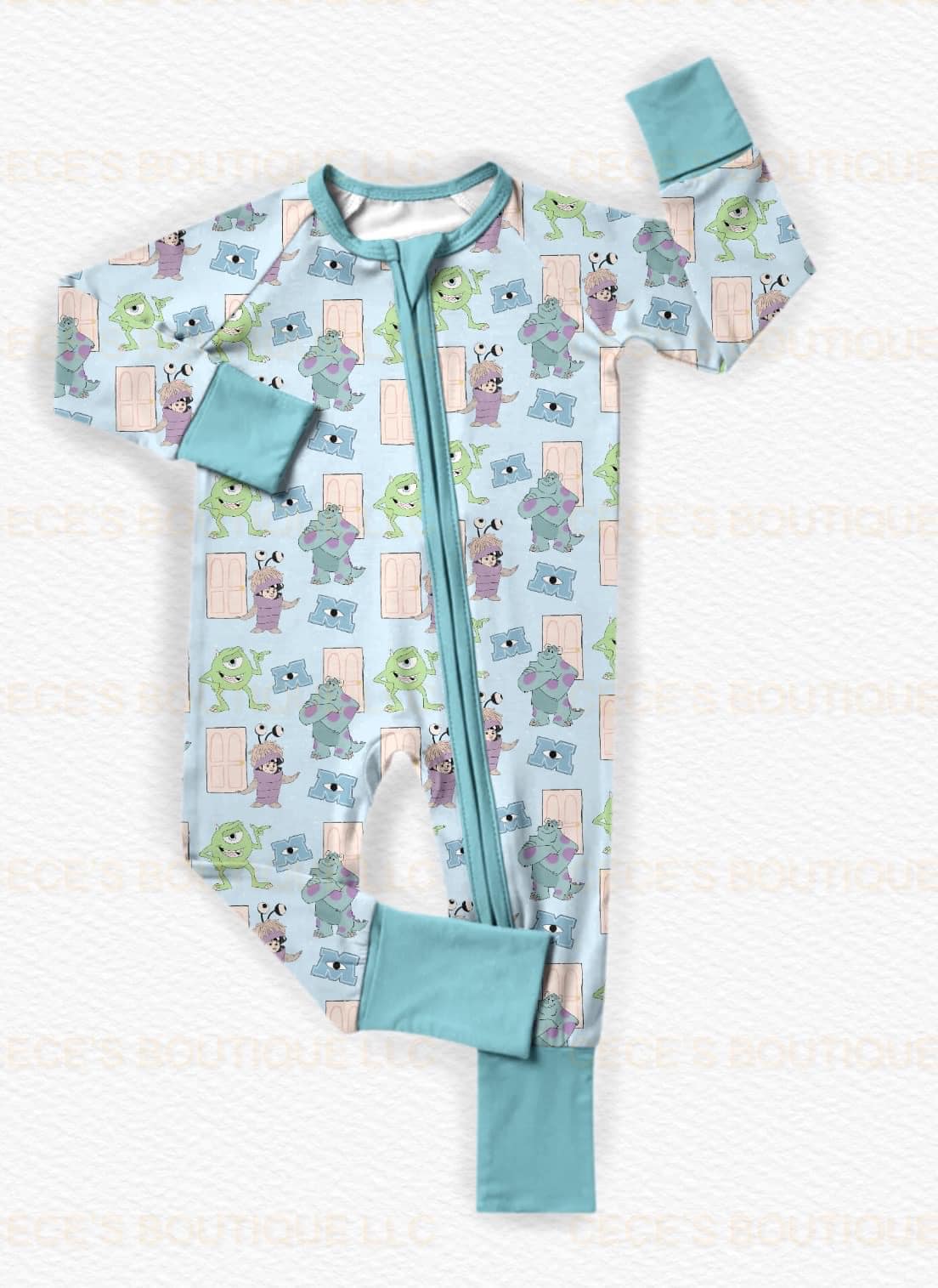 (Custom Design Preorder MOQ 20) Cartoon Monster Blue Print Baby Fall Bamboo Sleeper Zipper Romper
