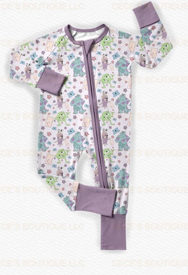 (Custom Design Preorder MOQ 20) Cartoon Monster Purple Print Baby Fall Bamboo Sleeper Zipper Romper